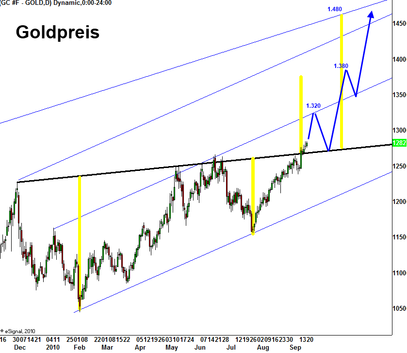 Nach meinem Dafürhalten ergeben sich auf Sicht von Wochen und Monaten für den Goldpreis charttechnisch ermittelte Kursziele von 1.380 $ und 1.480 $. Bei Erreichen von 1.380 $ muß mit einem Abprallen der Preisnotierungen nach unten gerechnet werden.