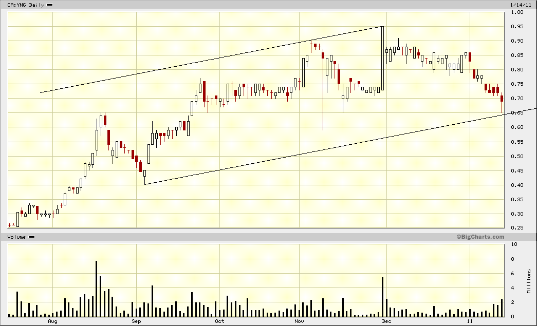 hat Mitte Dezember auch nicht so gut ausgesehen, wo wir bis fast auf 0,50€ zurückgekommen sind, trotzdem hatten wir dann einen Anstieg (an einem Tag) um gut 20%. Das kann hier jederzeit wieder passieren, so hoffe ich zumindest ! Will damit sagen, dass mir der Chart hier nicht sooo ausschlaggebend ist. Da ich bei YNG von den guten Aussichten überzeugt bin, bleibe ich auch dabei und sitze kleinere Korrekturen aus. Ich hoffe es bleibt bei kleineren, denn es gibt immer eine Schmerzgrenze !!