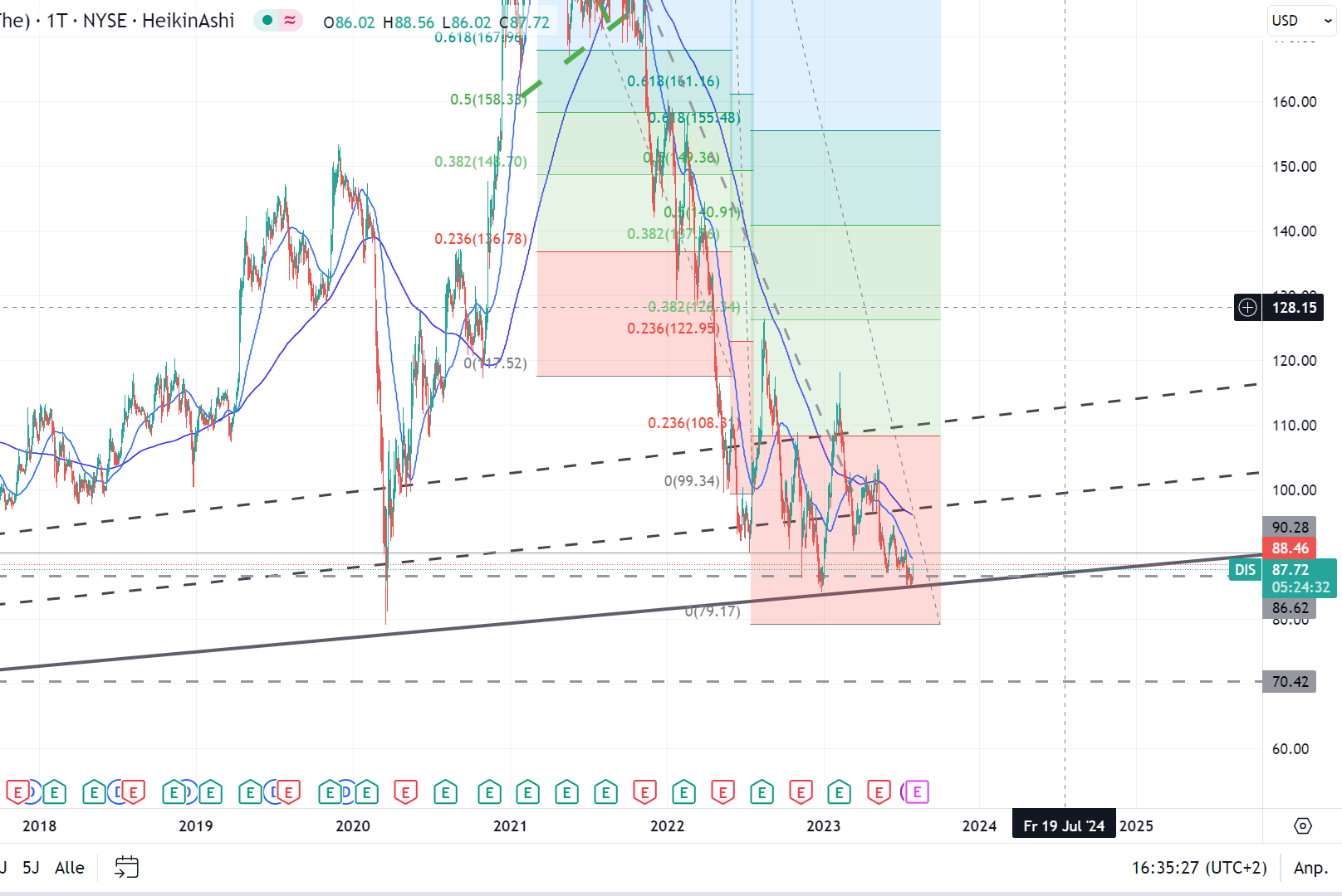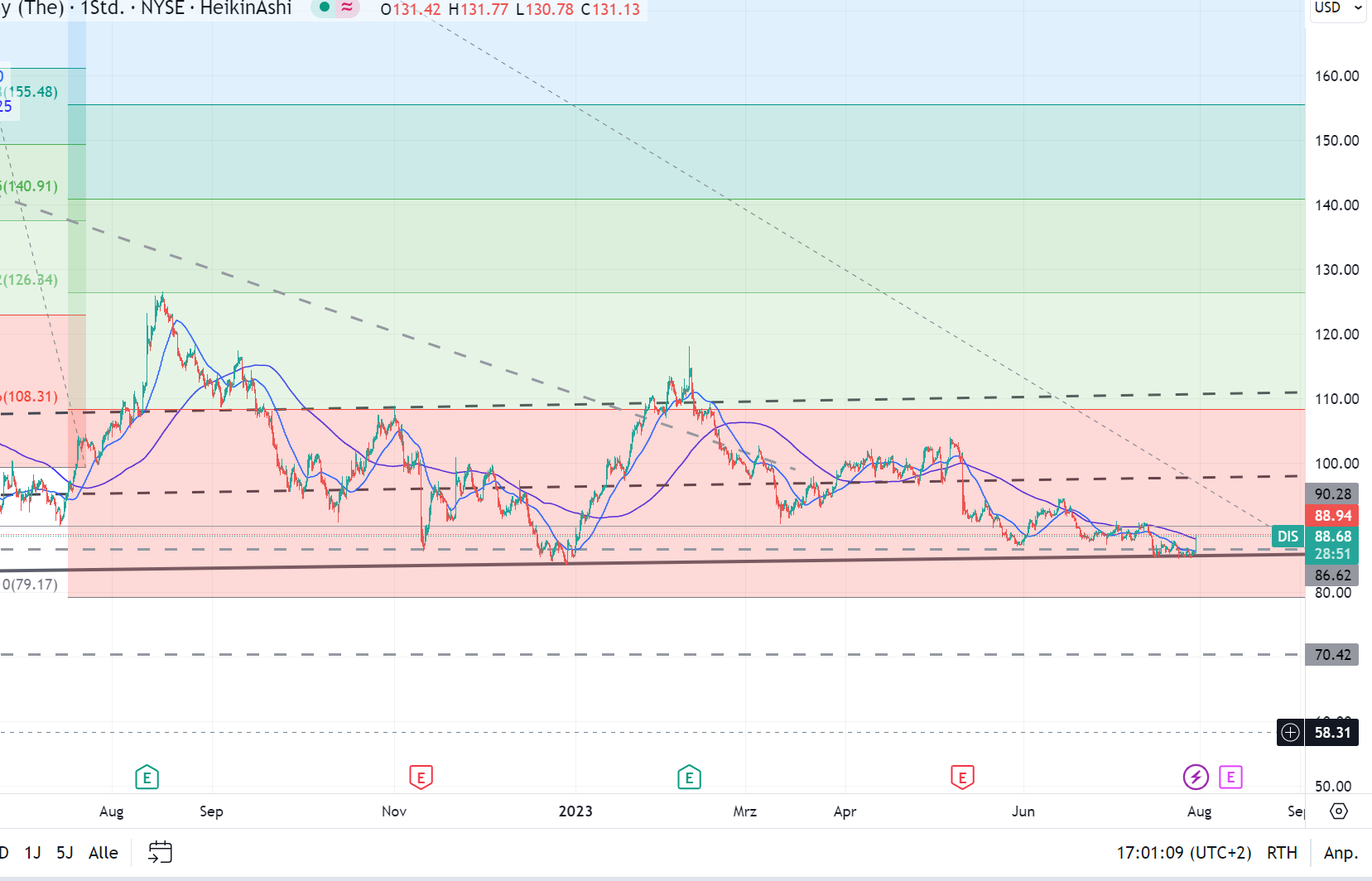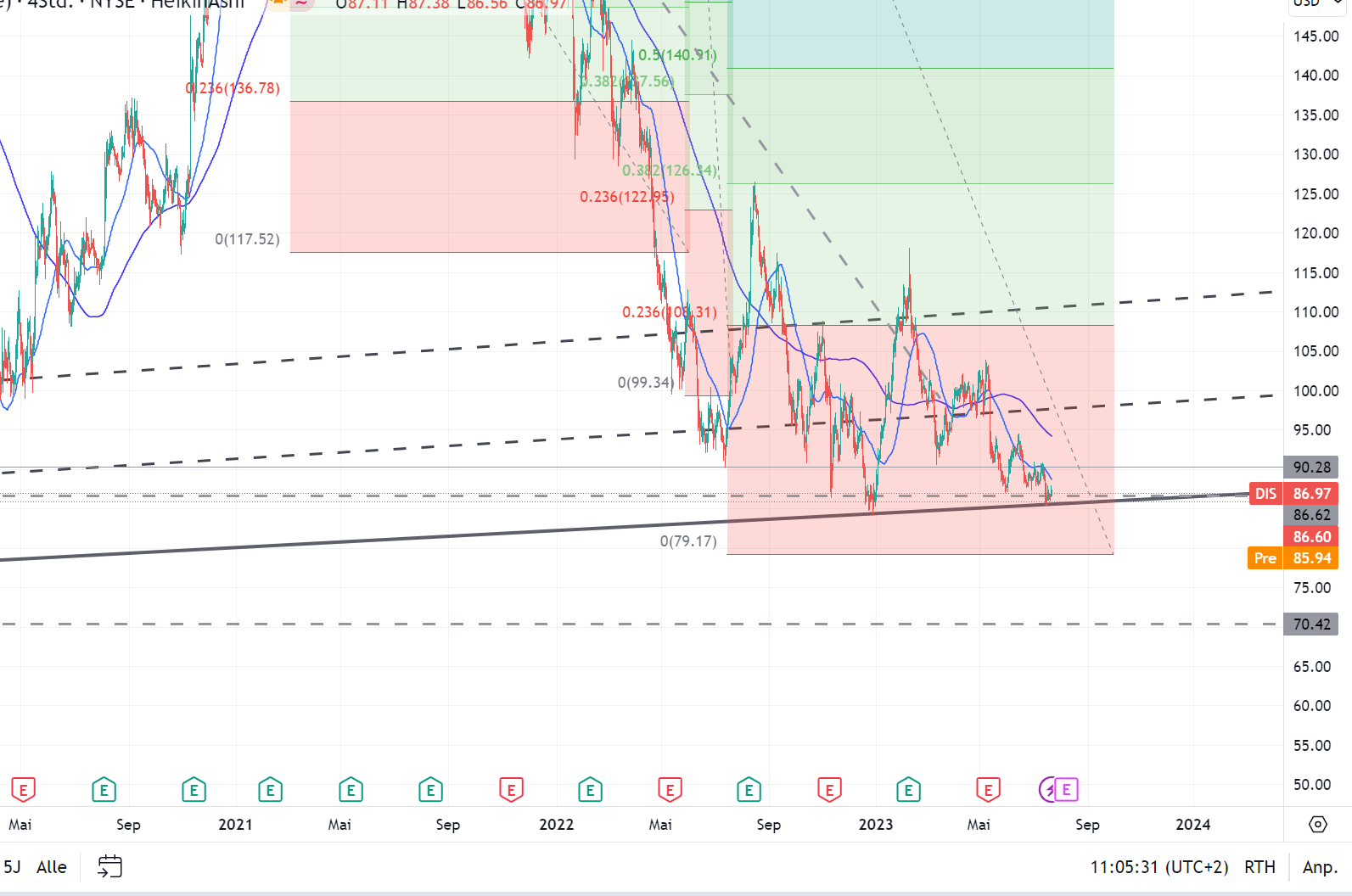 Charttechnisch sieht es nicht so aus, als sollte der Kurs an der aufsteigenden Unterstützung, die er schon getestet hat, stoppen. Es sieht eher danach aus, als wollte sich der 50er und 200er Durschnitt in diesem Jahr noch zweimal kreuzen und dann ist man auch, was die Targets anbelangt, ziemlich ernüchtert. Wenn gleich allmählich der Market cap irgendwo im Niveau des Marktwertes der Parks angekommen sein dürfte.