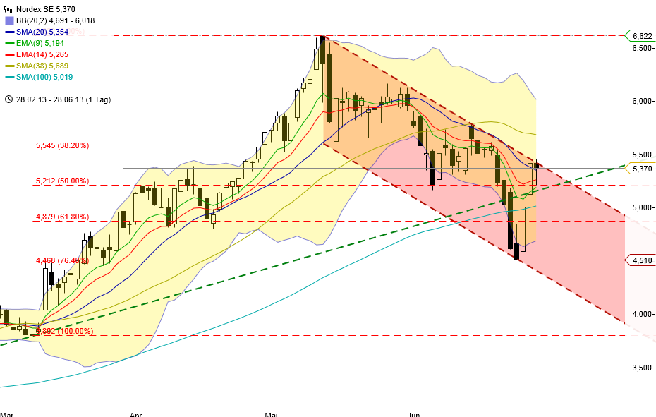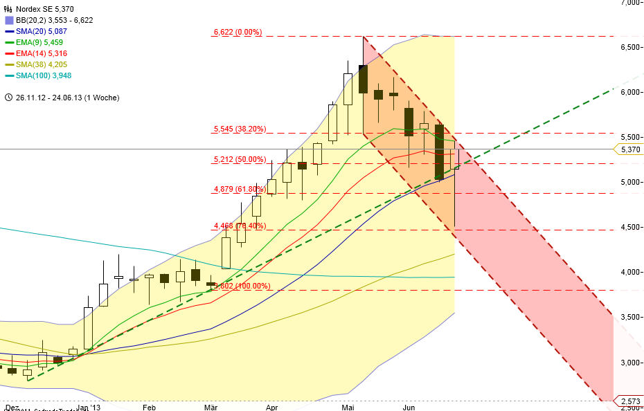 Auf Tageschartbasis ist der Kurs heute nochmal runter bis zum 9`er EMA und der langfristigen Aufwärtstrenlinie und dann am Ende mit SK knapp über dem mittlerem BB und kurz unter der Abwärtstrenlinie. Es bleibt also weiterhin spannend. Die Chancen das Nordex in der kommenden Woche den Abwärtstrend verlässt sind gegeben.