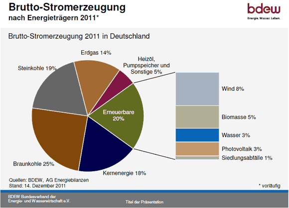 Info Berlin - Der Ökostrom-Anteil im Energiemix ist 2011 erstmals an Atomkraft und Steinkohle vorbeigezogen. Mit knapp 20 Prozent liegt Strom aus Wind, Wasser oder Sonne nun an zweiter Stelle nach der heimischen Braunkohle (24,6 Prozent), wie der Bundesverband der deutschen Energiewirtschaft (BDEW) in ersten Berechnungen ermittelt hat. 2010 lag der Ökostrom-Anteil noch bei 16,4 Prozent. Die Atomkraft spielt als Energieträger hingegen eine erheblich geringere Rolle als im vergangenen Jahr. Wegen der Abschaltung der Altmeiler sackte ihr Anteil von 22,4 auf nunmehr 17,7 Prozent ab. Steinkohle und Gas trugen mit 18,7 beziehungsweise 13,6 Prozent etwa ebenso viel zur Stromerzeugung bei wie im Jahr 2010. Unter den erneuerbaren Energiequellen ist Wind die wichtigste. Der Anteil der Windkraft im Strommix stieg laut BDEW von 6,0 Prozent im Jahr 2010 auf jetzt 7,6 Prozent. Sehr stark wuchs mit 1,9 auf 3,2 Prozent auch der Solarstrom und überholte damit sogar die Wasserkraft, deren Anteil als einziger der Öko-Energien leicht schrumpfte. Biomasse trug mit 5,2 Prozent zur deutschen Stromerzeugung bei. Bis zum Jahr 2020 sollen nach dem Willen der Bundesregierung 35 Prozent des deutschen Stroms aus erneuerbaren Energien erzeugt werden. Umweltminister Norbert Röttgen (CDU) rechnet damit, dass diese Anteil noch übertroffen werden wird. Der BDEW warnte allerdings, mit dem Zuwachs steige auch der Druck auf das Gesamtsystem. Die Erneuerbaren müssten in den Markt integriert werden, sagte Hauptgeschäftsführerin Hildegard Müller. Zudem müsse die schwankende Einspeisung von Strom aus Wind oder Sonne auch von den Netzen verarbeitet werden können. Auch der Stromriese RWE Chart zeigen warnte jüngst in einem Brandbrief an die Bundesregierung vor erheblichen Verzögerungen bei der Energiewende