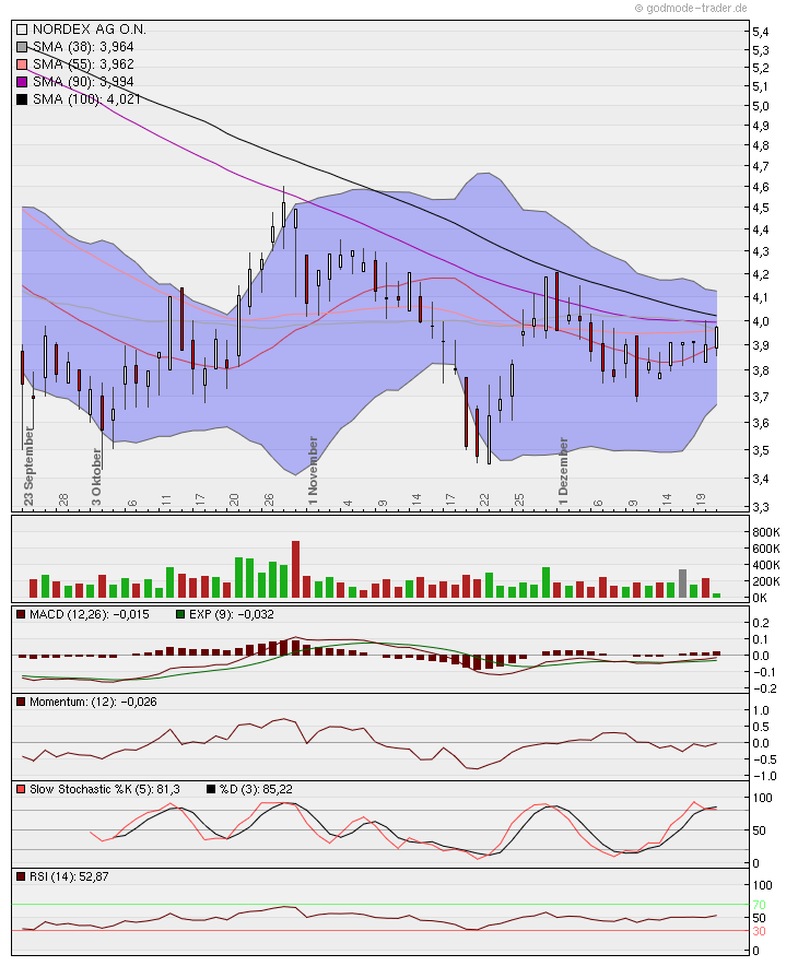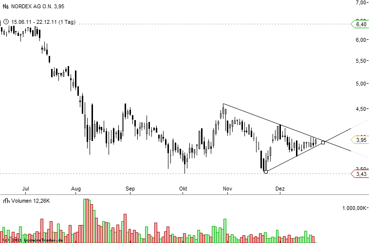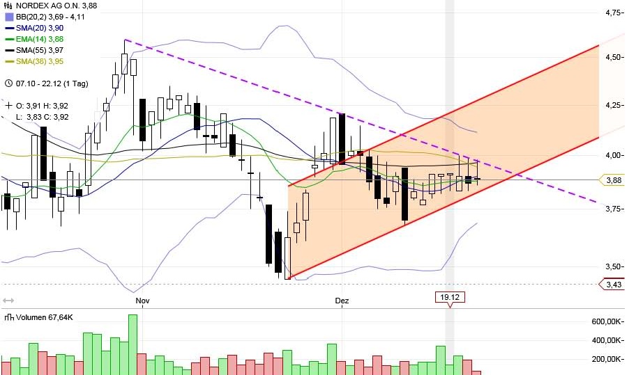 ... aus Chart technischer Sicht könnte in der kommenden Woche die Entscheidung fallen, ob Nordex die Abwärtstrendlinie die seit dem 28.10 besteht, durchbrechen kann oder ein weiterer Kursrückgang eintritt. Als zusätzliche Hürde fungiert auch die psychologsch wichtige Marke von 4 Euro. Weitere Hürden sind auch die GD`s 20, 55 und 36 sowie der 14`er EMA, der bereits gestern den 20`ger SMA von oben gekreuzt hat.