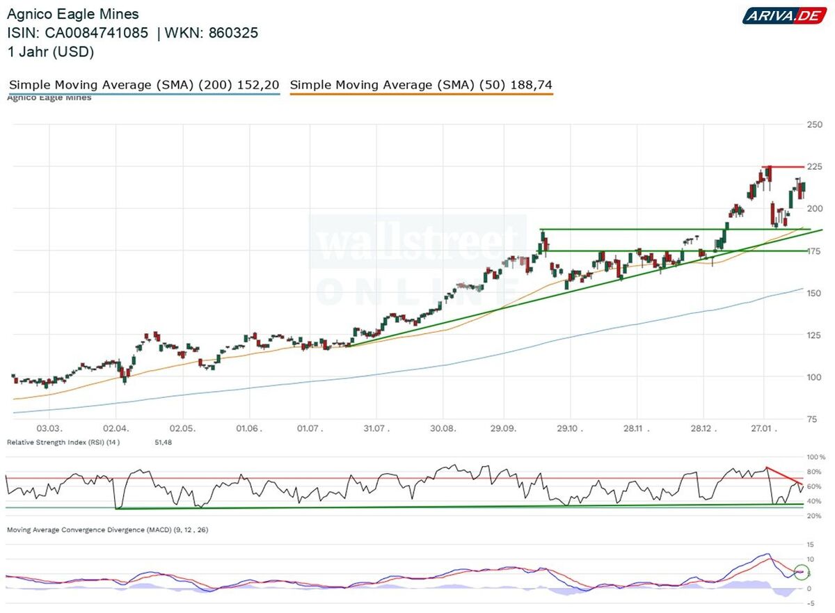 Mit einem Kurs um 216 US-Dollar (Stand: 18:00 Uhr) nähert sich Agnico Eagle Mines bereits wieder seinem bei rund 225 US-Dollar markierten Allzeithoch an. Ein Sprung darüber wäre ein starkes technisches Kaufsignal.