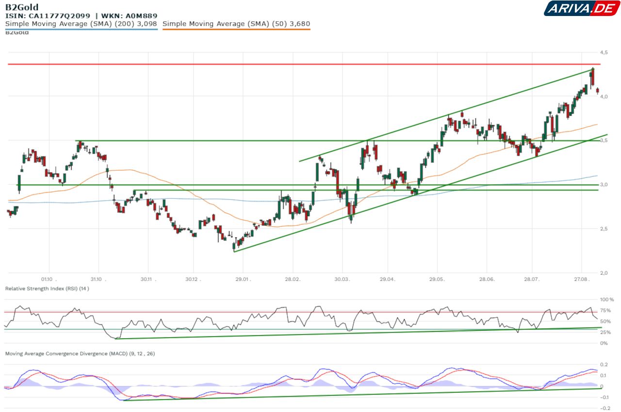 Dieser Anstieg wurde begleitet von steigenden technischen Indikatoren, was auf die Nachhaltigkeit des aktuellen Trends hindeutet. Allerdings notiert B2Gold gegenwärtig an der Oberkante des Aufwärtstrends sowie in Reichweite zum mehrjährigen Widerstand bei 4,30 US-Dollar. Daher ist kurzfristig mit Pullbacks zu rechnen – auch um den zwischenzeitlich überkauften Relative-Stärke-Index zu konsolidieren und abzukühlen.