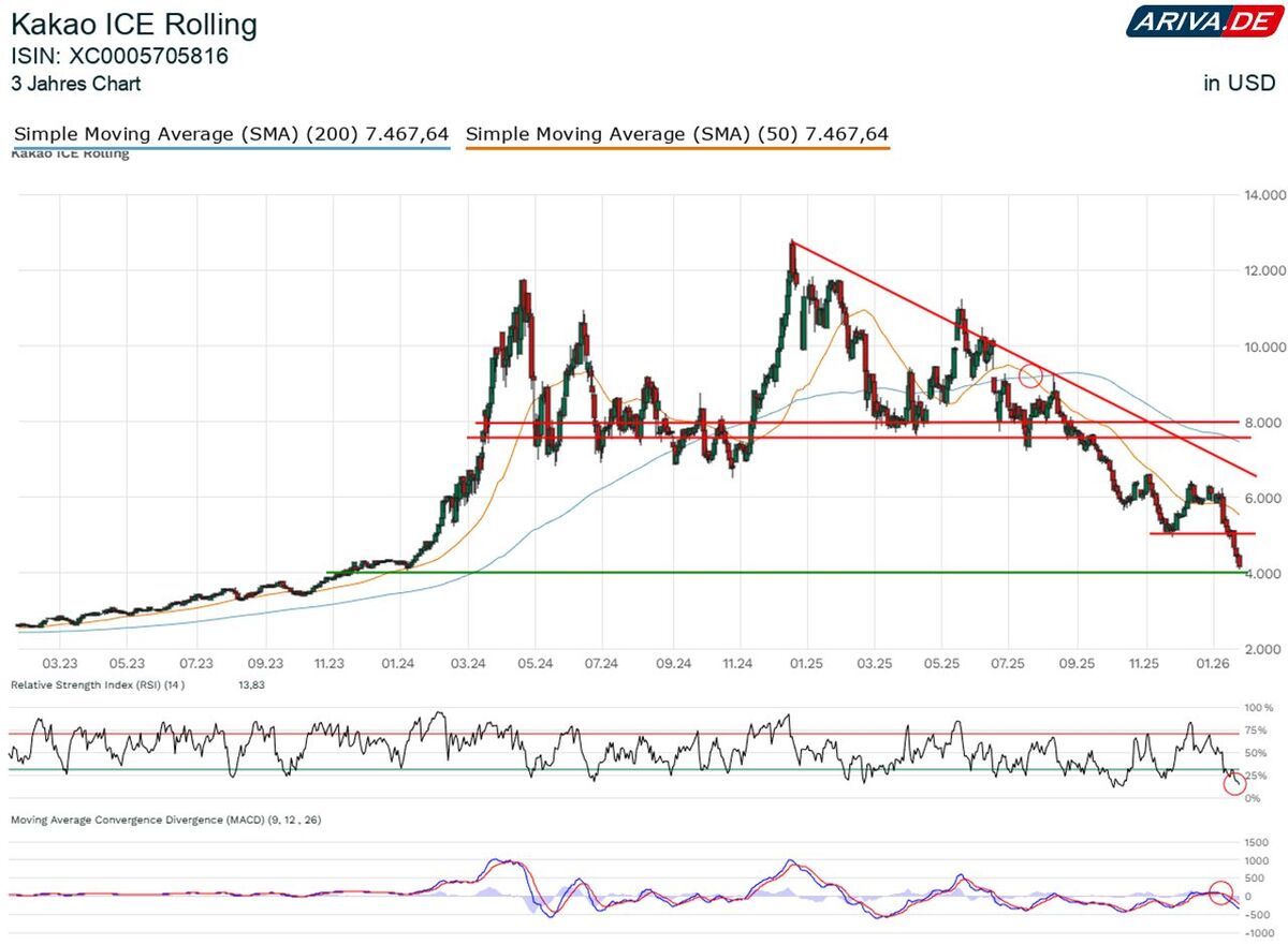 Mit Blick auf den Chart des Kakao-Futures ist ein Ende der Talfahrt noch nicht unbedingt abzusehen. Mit der 50-Tage-Linie sowie der Marke von 5.000 US-Dollar je Tonne hat der Kurs zwei wichtige Unterstützungen aufgegeben.