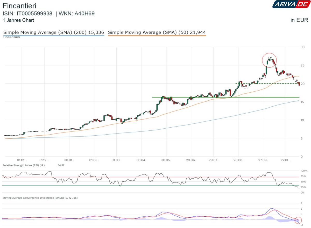 Doch seit Anfang Oktober wird das Kursgeschehen von starken Gewinnmitnahmen geprägt. Gegenüber ihrem Hoch bei rund 27,30 Euro hat Fincantieri bereits 30 Prozent an Wert verloren. Die am Mittwochmorgen vorgelegten Quartalszahlen sorgen nicht für eine Wende, sondern verstärken im Gegenteil den Verkaufsdruck noch.