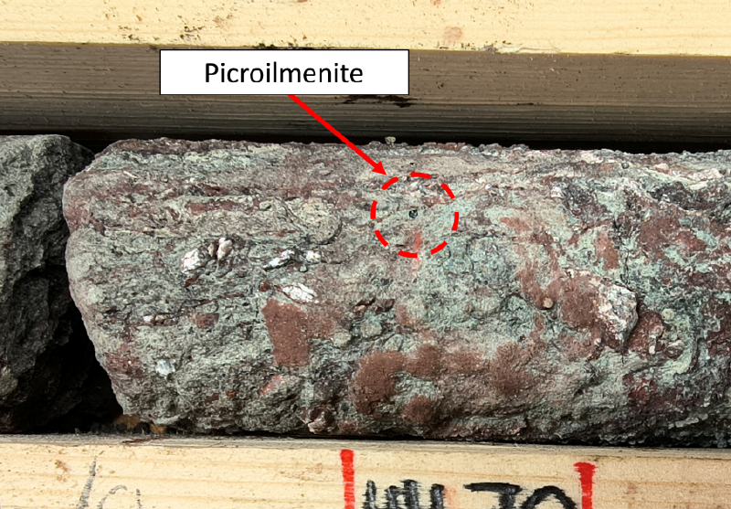Drill core samples are being prepared for detailed petrographic and geochemical analysis to formally classify the material and assess its diamond-bearing potential. Discovery of several picroilmenite xenocrysts in the altered lamproite (see photo) provide strong evidence that this or closely related intrusions could be the source of the Anomaly 5 indicator mineral train.