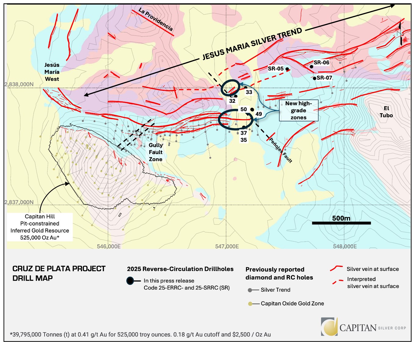 Drilling at Capitan's Cruz de Plata Project continues to intersect high-grade silver mineralization in step-out drilling, while expanding a new high-grade zone at the Jesus Maria Silver Trend west of the Peñoles Fault