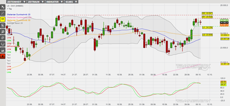 Der Nachdem am gestrigen Dienstag erneut Rücksetzer mit Käufen beantwortet wurden, schloss der DAX erneut mit einem marginalen Plus. Nach der dynamischen Aufwärtsbewegung der letzten Wochen könnte die mehrtägige enge Konsolidierung nun die Basis für eine Fortsetzung der übergeordneten Aufwärtsbewegung legen. Support erhält dieses Szenario durch die weiter intakten Kaufsignale des GD200, des GD20 und des GD50.