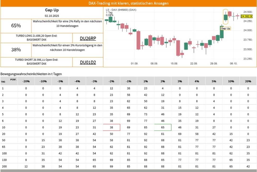 Die Erfolgswahrscheinlichkeiten für das Signal „Gap Up“ beruhen auf einer historischen Auswertung des Signals auf den LS-DAX im Zeitraum vom 02.01.2000 bis zum 07.10.2025. Dabei wurden die folgenden Voreinstellungen und Filter vorgenommen: