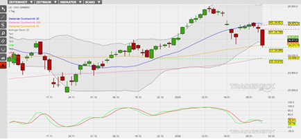 Charttechnisch hat der DAX nach der Etablierung eines Allzeithochs am 13. Januar die Basis für eine untergeordnete Abwärtstrendstruktur gelegt. Ein erstes Verlaufstief wurde dabei am 21. Januar markiert, bevor eine Zwischenerholung am 27. Januar in einem niedrigeren Verlaufshoch gemündet ist. Anschließend wurde eine zweite Verkaufswelle eingeleitet, welche den DAX am 29. Januar mit einer langen roten Tageskerze unter das untere Bollinger-Band und auf ein neues Verlaufstief geführt hat. Charttechnisch konnte dabei der gleitende Durchschnitt der letzten 50 Börsentage (= GD 50) im ersten Anlauf noch verteidigt werden. Sollte der Abgabedruck allerdings zunehmen, dann könnte der nachhaltige Abverkauf unter den gleitenden Durchschnitt ein weiteres Verkaufssignal erzeugen. Derzeit weisen bereits der gleitende Durchschnitt der letzten 20 Tage (= GD 20) sowie die Slow Stochastik belastende Verkaufssignale aus.