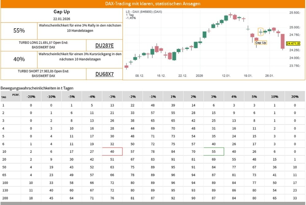 Die Erfolgswahrscheinlichkeiten für das Signal „Gap Up“ beruhen auf einer historischen Auswertung des Signals auf den LS-DAX im Zeitraum vom 02.01.2000 bis zum 29.01.2026. Dabei wurden die folgenden Voreinstellungen und Filter vorgenommen: