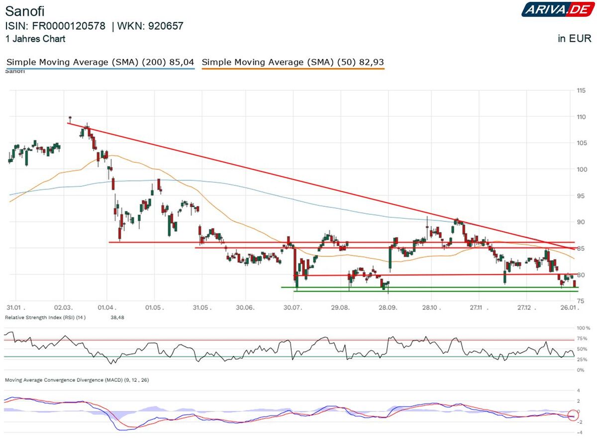 In der Vorbörse konnten die Anteile von der gelungenen Vorstellung noch profitieren. Die Aktie kletterte zeitweise um rund 4 Prozent, womit sie den bei 80 Euro liegenden Widerstand zurückerobern konnte. Die Zugewinne wurden aber unmittelbar nach Börseneröffnungen verkauft. Am Donnerstagvormittag handelt Sanofi nach einem Vorzeichenwechsel leicht im Minus bei rund 77,40 Euro.