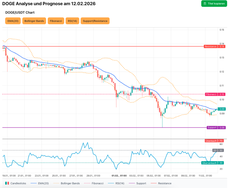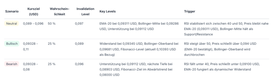 Die kurzfristige Prognose für DOGE bleibt neutral bis leicht bullisch aufgrund des Close über dem EMA‑20 und steigender Intraday‑Struktur. Unterstützungen liegen bei 0,09112 US-Dollar und 0,08903 US-Dollar, Widerstände bei 0,09345 US-Dollar und 0,09643 US-Dollar. Ein stabiler Ausbruch über 0,094 US-Dollar (Bestätigung oberhalb des EMA‑20) könnte den Weg Richtung 0,11 US-Dollar ebnen, während ein Bruch unter 0,091 US-Dollar das Risiko Richtung 0,085 bis 0,080 US-Dollar erhöht. Beobachte den RSI und die Bollinger‑Expansions als kurzfristige Trigger für eine Trendfortsetzung oder -Umkehr.
