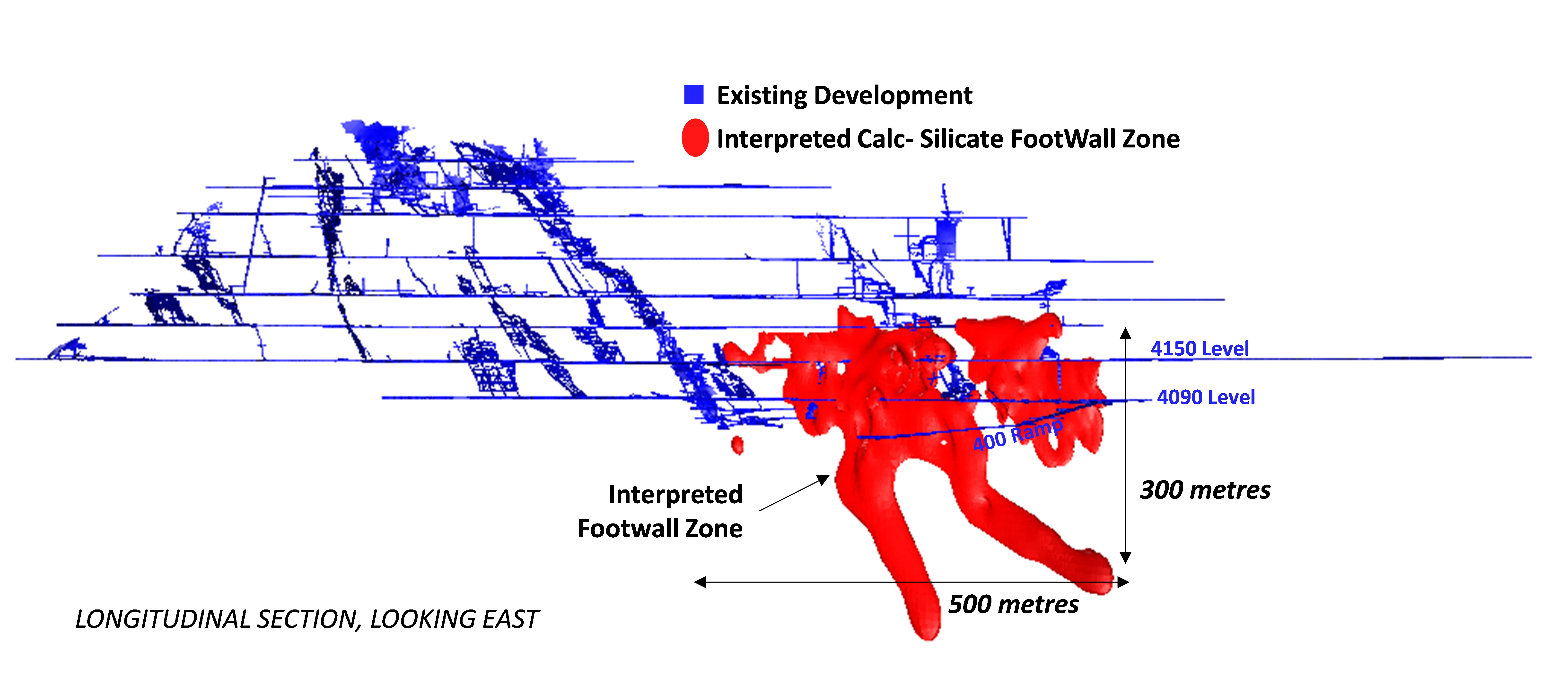 Figure 4: Longitudinal View, Looking East - Interpretation of the Footwall Zone Exploration Area
