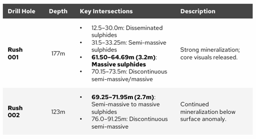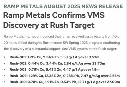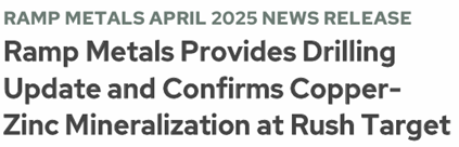 Die Geologen sollten recht behalten – und wie. Tatsächlich waren die dortigen Rush-Probebohrungen im direkten Grenzgebiet zum Rottenstone North-Projekt ein riesiger Erfolg! Ramp Metals konnte auf Rush gewaltige Vorkommen an Kupfer und Zink nachweisen! Der Kupfergehalt lag mit 1,61 % extrem hoch für ein neu gefundenes Vorkommen in Nordamerika.