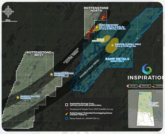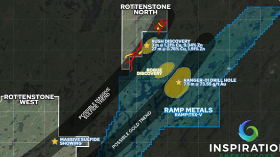 Geologische Strukturen in der Erde enden nicht an Gebietsgrenzen, sondern laufen weiter – vermutlich tief in das Rottenstone North-Projekt hinein. Denn die beiden Projekte trennt sprichwörtlich ein Gartenzaun! Ramp Metals hat seine höchst erfolgreichen Treffer für überdurchschnittliche Kupfer-Zink-Vorkommen in genau dem gleichen Gesteinsgürtel erzielt, in dem Inspiration Energy von April 2026 an sein erstes Bohrprogramm durchführen wird!