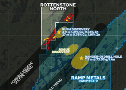 Sie sehen in der Grafik den oberen schwarzen Gürtel an potenziellen Rohstoffvorkommen, der mit „Possible Massive Sulfide Trend“ bezeichnet ist. Genau in diesem Gürtel hat Ramp Metals direkt an der Grenze zu Rottenstone North seine hoch erfolgreichen Kupfer-Zink-Entdeckungen gemacht (oberer gelber Fleck mit Stern).