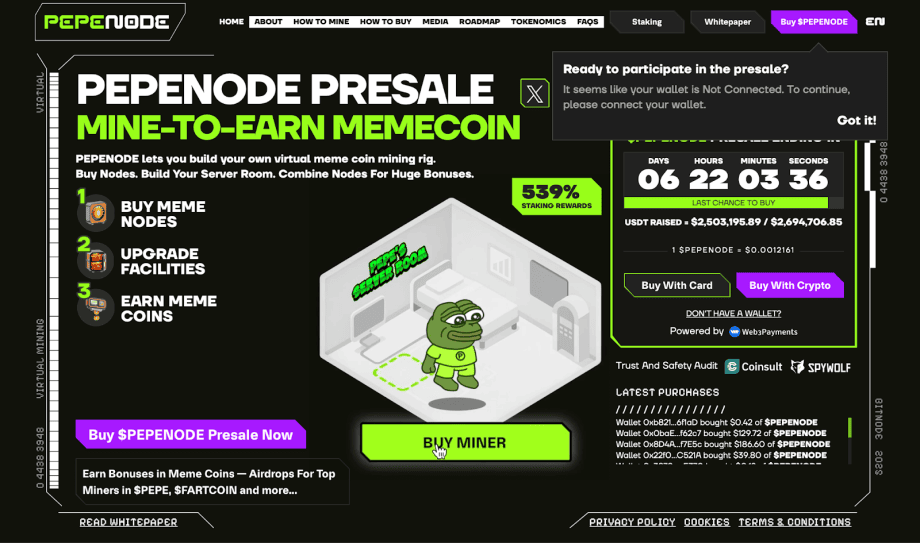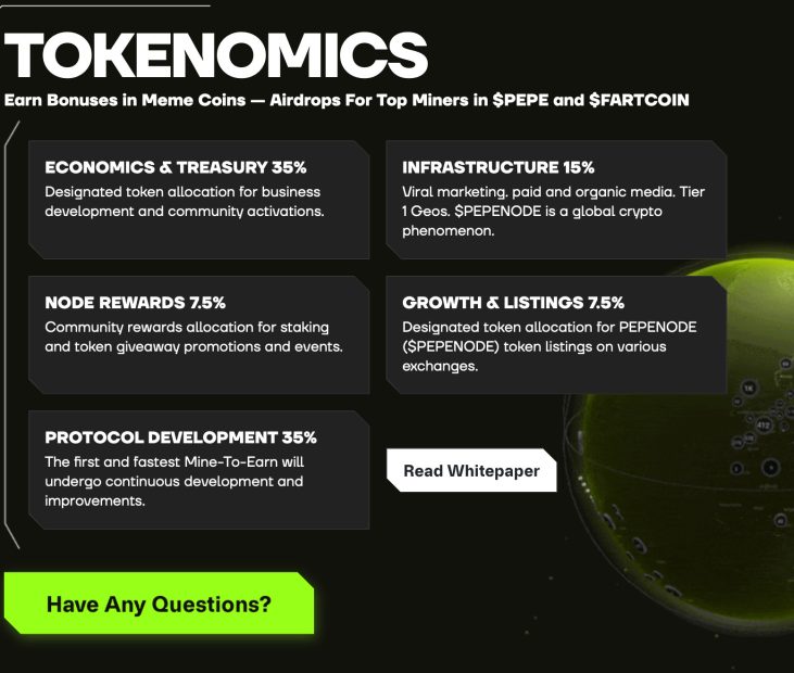PepeNode etabliert derweil ein neuartiges Modell, bei dem virtuelle Mining-Prozesse vollständig über den PEPENODE-Token gesteuert werden. Der aktuell im Presale erhältliche Token bildet die Grundlage für den Erwerb digitaler Mining-Rigs, mit denen einzelne Nodes betrieben und ausgebaut werden.