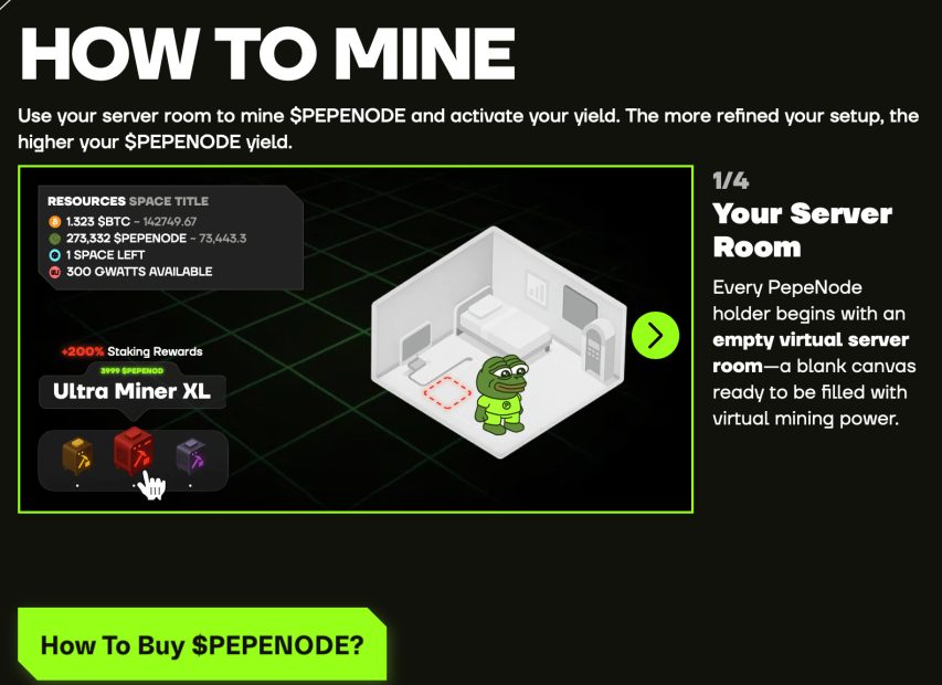 Im Zentrum steht die Umwandlung klassischen Minings in ein strategisches Aufbauspiel. Nutzer starten in einem leeren Raum und errichten Schritt für Schritt ein virtuelles Rechenzentrum. Nodes werden erworben, Serverbereiche optimiert und einzelne Komponenten gezielt verbessert. Dadurch entsteht ein langfristiger Management-Charakter, der über reine Unterhaltung hinausgeht. PepeNode greift ein prägendes Element der frühen Krypto-Ära auf und überführt es durch Gamification in ein modernes Web3-Gaming-Erlebnis.