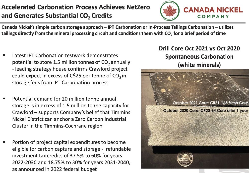 Doch was Canada Nickel (WKN: A2P0XC) wirklich von anderen Unternehmen unterscheidet und abhebt, neben seiner extrem günstigen Marktkapitalisierung von nur rund 180 Mio. CAD (rund 115 Mio. EUR), ist der ‚Net-Zero‘-Ansatz. Durch eine bahnbrechende CO2-Speichertechnologie wird das Unternehmen voraussichtlich 1,5 Millionen Tonnen CO2 pro Jahr eliminieren und damit, als einer der ganz wenigen Bergbaukonzerne weltweit einen netto-negativen CO2-Fußabdruck hinterlassen.