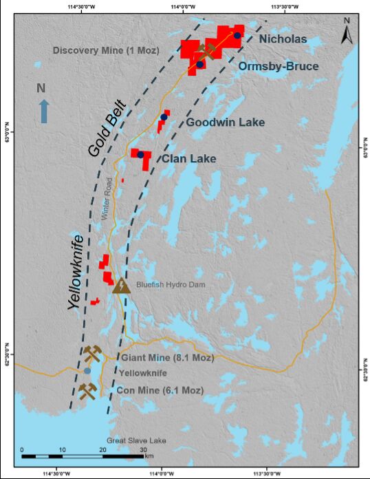 Denn ‚Yellowknife‘ ist in jeder Hinsicht ein Projekt der Superlative. Das 12.239 Hektar große Grundstück im hochgradigen ‚Yellowknife-Grünsteingürtel‘ im Norden Kanadas, der übrigens auf eine 90-jährige Goldgeschichte zurückblickt, besteht mit ‚Ormsby – Bruce‘, ‚Nicholas Lake‘, ‚Goodwin Lake‘, ‚Clan Lake‘ und ‚Big Sky‘ aus fünf gehaltvollen Claims.