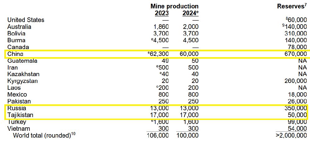 China steht mit über Hälfte der globalen Produktion mit weitem Abstand an der Spitze der Antimon-herstellenden Länder und hatte mit seinen Export-Einschränkungen im letzten Jahr und dem Export-Bann für die USA für eine Verdopplung des Antimon-Preises von 8,91 USD pro Pfund im Juli 2024 auf 17,50 USD/Pfund im September 2024 gesorgt2.