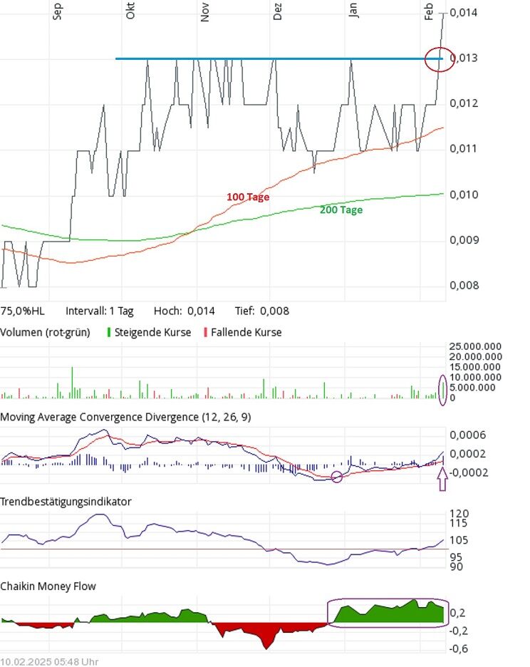 Der australische Technologieentwickler für Wasseraufbereitung Parkway Corporate (ASX: PWN: FRA: 4IP) hat den im Chartcheck vom 3. Februar dargestellten Schwung genutzt und nun endlich den seit Oktober bestehenden Kursdeckel bei 0,013 Australischen Dollar mit den vierthöchsten Umsätzen der letzten sechs Monate überwunden.
