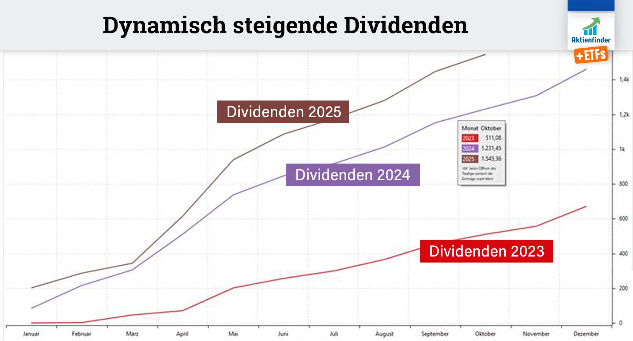 Der untere Chart zeigt, wie stark die Einnahmen durch Dividenden nach nicht einmal drei Jahren gestiegen sind. Bereits im laufenden Jahr haben die Dividenden-Aktien mit 1.500 € Dividende 300 € mehr als noch im Vorjahr ausgeschüttet.