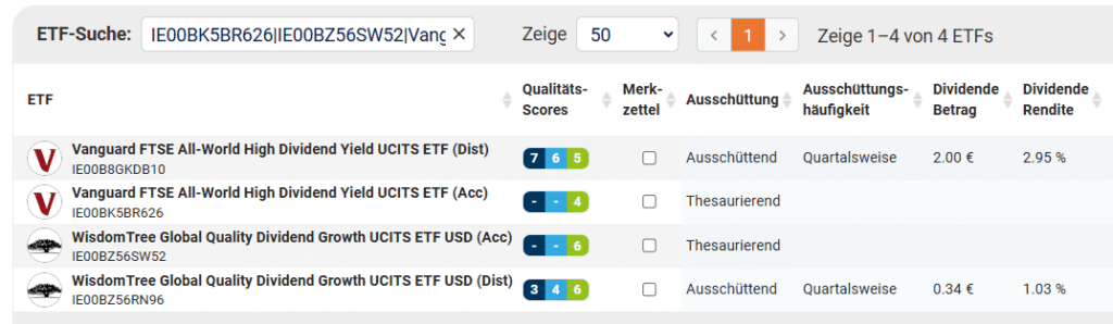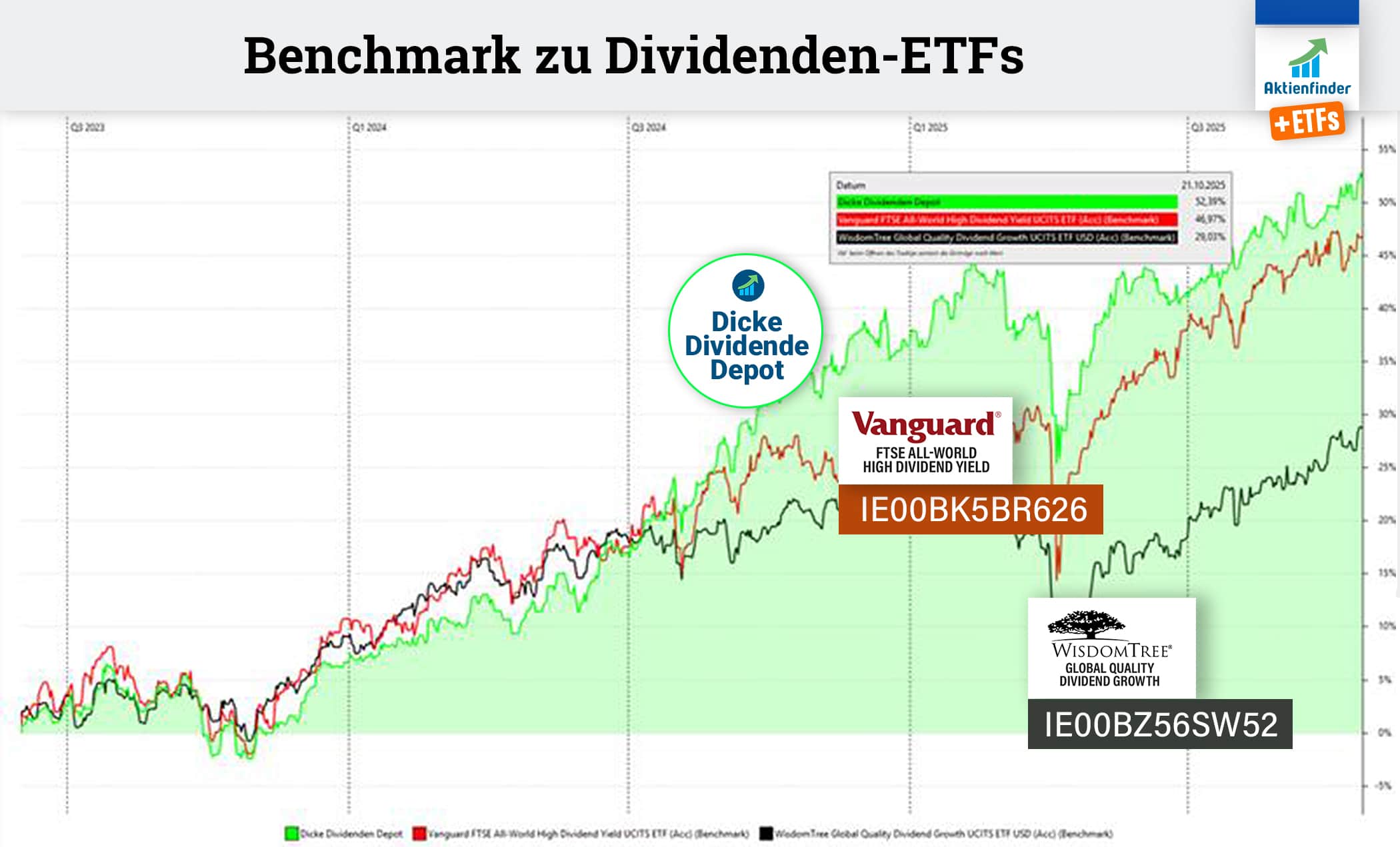 Um nicht Äpfel mit Birnen zu vergleichen, sollten wir den Erfolg des Dicke Dividenden Depots jedoch an Dividenden-ETFs messen, die eine ähnlich hohe und verlässliche Dividende bieten können. Unsere Benchmarkwahl fiel auf den thesaurierenden Vanguard FTSE All-World High Dividend Yield ETF (IE00BK5BR626) und den thesaurierenden WisdomTree Global Quality Dividend Growth ETF (IE00BZ56SW52). Diese beiden ETFs zählen zu den größten thesaurierenden Dividenden-ETFs mit weltweitem Anlagefokus. Die ausschüttenden Pendants schütteten in den letzten 12 Monaten eine Dividende von fast 3 Prozent und knapp über 1 Prozent aus. Zum Vergleich kommt das Dicke Dividenden Depot auf eine Dividendenrendite von 3,1 Prozent.