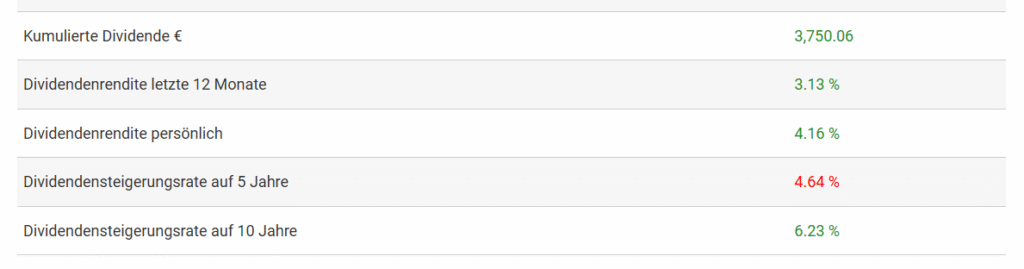 Die aktuelle Dividendenrendite des Dicke Dividenden Depots liegt bei 3,1 Prozent. Auf den Einstandskurs bezogen fällt die Dividendenrendite mit 4,2 Prozent noch deutlich höher aus! Mit der Zeit ist die kumulierte Dividende bereits auf über 3.700 € gestiegen.