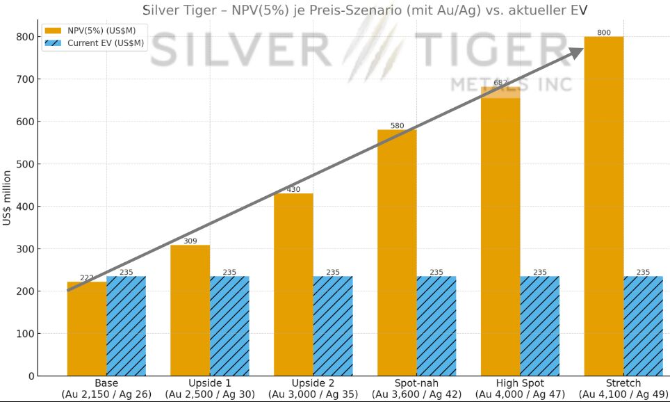 Um die Dimension klarzumachen, hilft der Vergleich mit Orla Mining: Orla betreibt in Mexiko ein sehr ähnliches ‚Open-Pit-Heap-Leach‘-Projekt (‚Camino Rojo‘), aber unserer Meining nach mit weniger Underground-Upside als ‚El Tigre‘. Und genau hier liegt der Silver Tiger-Hebel: ‚El Tigre‘ hat auf Basis der Unternehmens-Sensitivität bei Spot-Niveaus um ~4.000,- USD/oz Gold und ~47,- USD/oz Silber bereits einen NPV(5%) von über 680 Mio. USD – und mit leicht optimierten Annahmen (Effizienz/Preis/Selektivität) ist eine „runde“ Größenordnung von ~800 Mio. USD NPV(5%) realistisch, gegenüber ~222 Mio. USD bei 2.150,- USD je Unze Gold und 26,- USD je Unze Silber, im Basis-Szenrio!