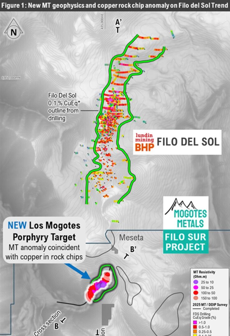 Bei späteren Arbeiten konnte dann sogar ‚Mesetas‘-Ressource bis ins Gebiet von Chile erweitert werden. Zudem wurden zwei weitere neue Ziele identifiziert. Dazu zählt der ‚Los-Mogotes-Cluster‘ mit 650 m × 500 m und mit anomalen Cu-Gehalten von bis zu 0,59 % Cu.
