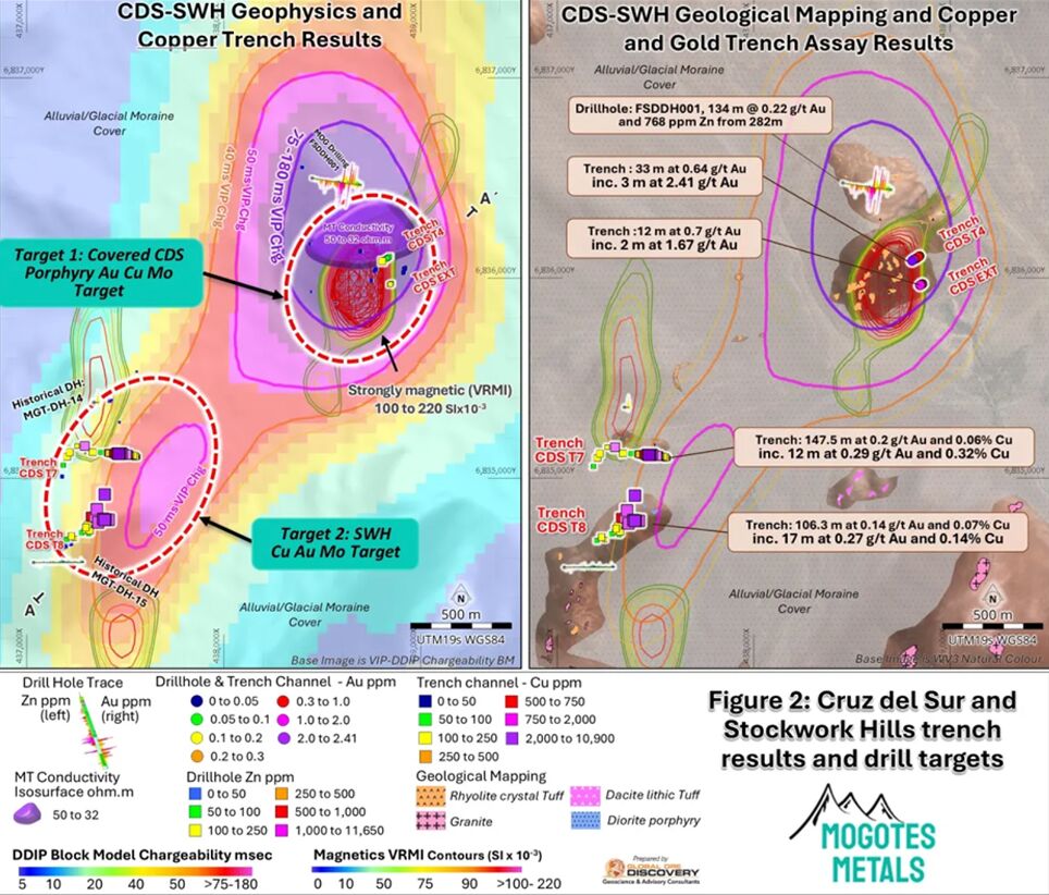 Beim ‚Cumbre‘-Ziel wiederum stieß Mogotes sein Team auf mehrere quer verlaufende Strukturen, die hochgradige ‚Stockwork‘-Adern aufweisen, welche möglicherweise mit der Spitze eines verborgenen Porphyr- oder epithermalen Systems in Verbindung stehen.