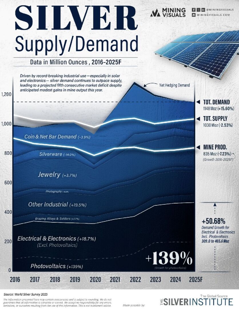Denn auch wenn der Verbrauch je Einheit sinkt, explodiert gleichzeitig die weltweite Nachfrage – befeuert von der globalen Elektrifizierung, der Energiewende und der rasanten Expansion erneuerbarer Technologien. Die Photovoltaikbranche wächst mit zweistelligen Raten – und mit ihr der Bedarf an Silber als leitfähigem und unersetzlichem Schlüsselmaterial.