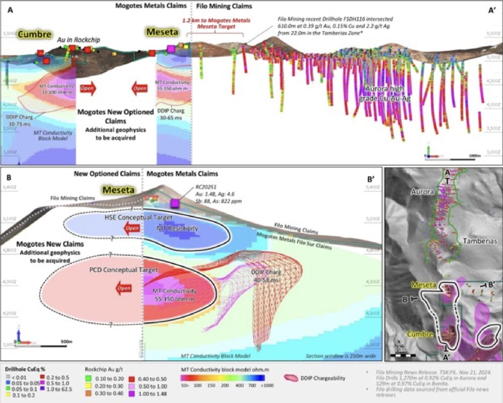 Mogotes Metals (WKN: A3ENQ6) hat die Geophysik auf das nächste Level gehoben: Eine Kombination aus fortschrittlicher 3D-Vektor-‚IP‘/‚MT‘ und tief eindringender ‚IP‘/‚MT‘ untersucht nun das Potential der ‚Cumbre‘- und ‚Meseta‘-Ziele auf den neuen ‚Claims‘. Diese geophysikalischen Untersuchungen haben bereits großflächige Anomalien identifiziert, die auf verborgenes ‚HSE‘- und ‚PCD‘-Mineralisierungspotenzial hindeuten.