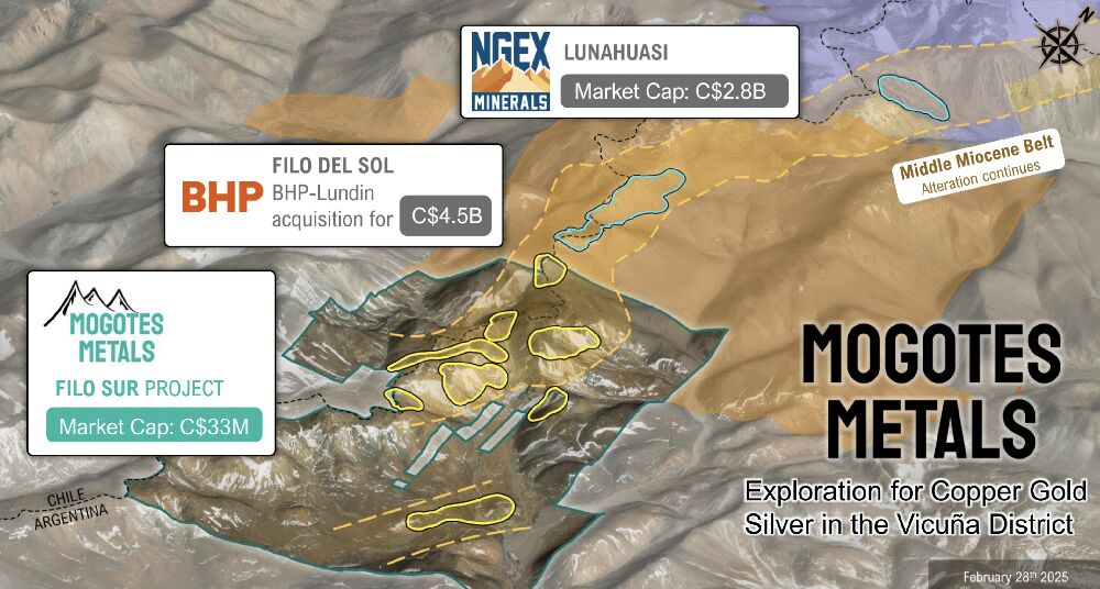 Erst kürzlich hat Mogotes (WKN: A3ENQ6) seine Position durch den Erwerb neuer ‚Claims‘ im ‚Vicuña‘-Distrikt nochmals deutlich gestärkt. Diese Erweiterung vergrößert das Portfolio auf rund 10.000 Hektar, und zwar direkt neben dem ‚Filo Del Sol‘-Projekt, das sich gerade als Paradebeispiel für die Kupfer- und Goldproduktion in der Region etabliert hat. Die neu erworbenen ‚Claims‘, insbesondere die ‚CMP‘-Claims, grenzen direkt an die ‚Filo Del Sol‘-Projektgebiete von Filo Corp. – eine unglaublich wertvolle Nachbarschaft für ein Unternehmen mit den gleichen Ambitionen!