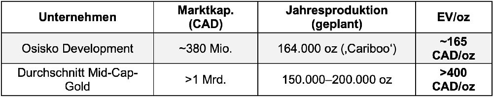Aktuelle Marktkapitalisierung: ~380 Mio. CAD Produktionsziel: 164.000 oz/Jahr! Das ergibt ein EV/oz von ~165 CAD – während vergleichbare Mid-Cap-Entwickler locker bei >400 CAD/oz gehandelt werden.