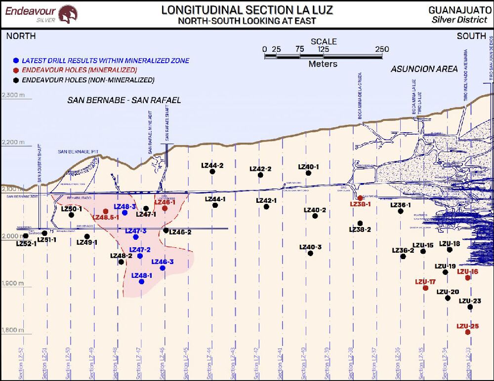 Im letzten Quartal des vergangenen Jahres brachte Endeavour Silver (WKN: A0DJ0N) dort ein übertageDiamantbohrprogramm an den Start, um diese an sich schon fetten Ressourcen zu erweitern und die Lebensdauer der ‚Bolañitos‘-Mine zu verlängern. Im Fokus stand hierbei die nördliche Erweiterung der hochgradigen Ader ‚La Luz‘, in einem Gebiet, in welchem Endeavour Silver (WKN: A0DJ0N) bereits vor einigen Jahren schon abgebaut hat und das praktisch nur einen ‚Nugget-Wurf‘ weit entfernt von der Mine ‚Asunción‘ entfernt ist.
