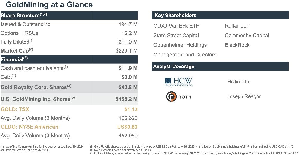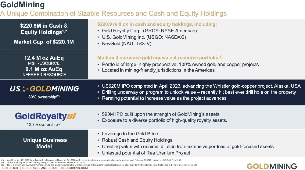 Angaben zu Interessenskonflikten: Die Herausgeber und verantwortliche Autoren erklären hiermit, dass folgende Interessenskonflikte hinsichtlich des in dieser Veröffentlichung besprochenen Unternehmen, GoldMining, zum Zeitpunkt der Veröffentlichung bestehen: I. Autoren und die Herausgeberin sowie diesen nahestehende Consultants und Auftraggeber halten zum Zeitpunkt der Veröffentlichung keine Aktienbestände in den zuvor genannten Unternehmen, behalten sich aber vor, zu jedem Zeitpunkt und ohne Ankündigung Aktien zu kaufen und zu verkaufen. II. Autoren oder die Herausgeberin oder Auftraggeber sowie diesen nahestehende Consultants unterhalten zum Zeitpunkt der Veröffentlichung kein direktes Beratungsmandat mit GoldMining, erhalten aber für die Berichterstattung ein Entgelt, vom Unternehmen. III. Autoren und die Herausgeberin wissen nicht, ob andere Börsenbriefe, Medien oder Research-Firmen die Aktien von GoldMining im gleichen Zeitraum besprechen, weshalb es in diesem Zeitraum zur symmetrischen Informations- und Meinungsgenerierung kommen kann. IV. Es handelt sich bei dieser Veröffentlichung der JS Research GmbH ausdrücklich nicht um eine Finanzanalyse, sondern um eine Veröffentlichung eines ganz deutlichen und eindeutig werblichen Charakters im Auftrag des besprochenen Unternehmens und ist somit als Werbung/Marketingmitteilung zu verstehen.