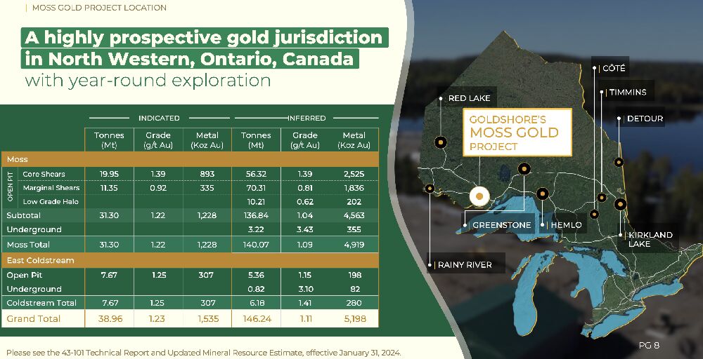 Mit einem beeindruckenden Ressourcenbestand von 6,7 Millionen Unzen Gold positioniert sich das ‚Moss‘-Goldprojekt als eines der vielversprechendsten Goldvorkommen in Kanada. Perfekt gelegen, in nur 110 km Entfernung von Thunder Bay und direkt am Trans-Canada-Highway, profitiert Goldshore Resources (WKN: A3CRU9) von sehr guter Infrastruktur und damit auch von einem entscheidenden logistischen Vorteil, der seinesgleichen sucht.