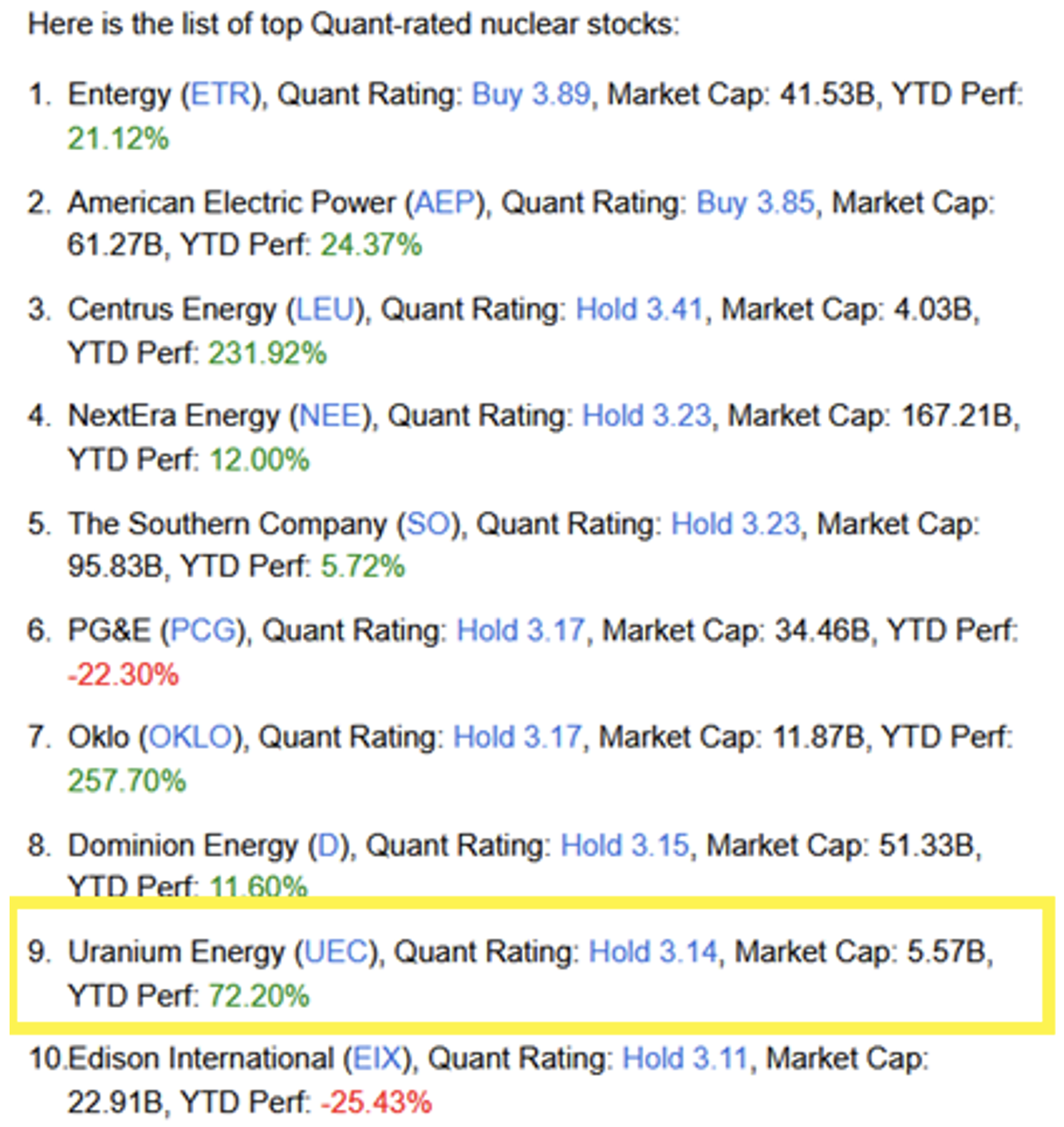 Gerade in Zeiten, in denen die Big Player mehr und mehr an die Grenzen ihrer hochwertigen Lagerstätten stoßen, während der Uran-hungrige Markt bedient werden will, schlägt die Stunde von diversifizierten Durchstartern wie Uranium Energy (WKN: A0JDRR). Das sehen die Top-Analysten von Seeking Alpha übrigens genauso und führen das Unternehmen, das eine schwindelerregende Year-to-Date-Performance von +72,2 % hingelegt hat, in den TOP 10 ihrer vielbeachteten Quant-Rating-Liste.5