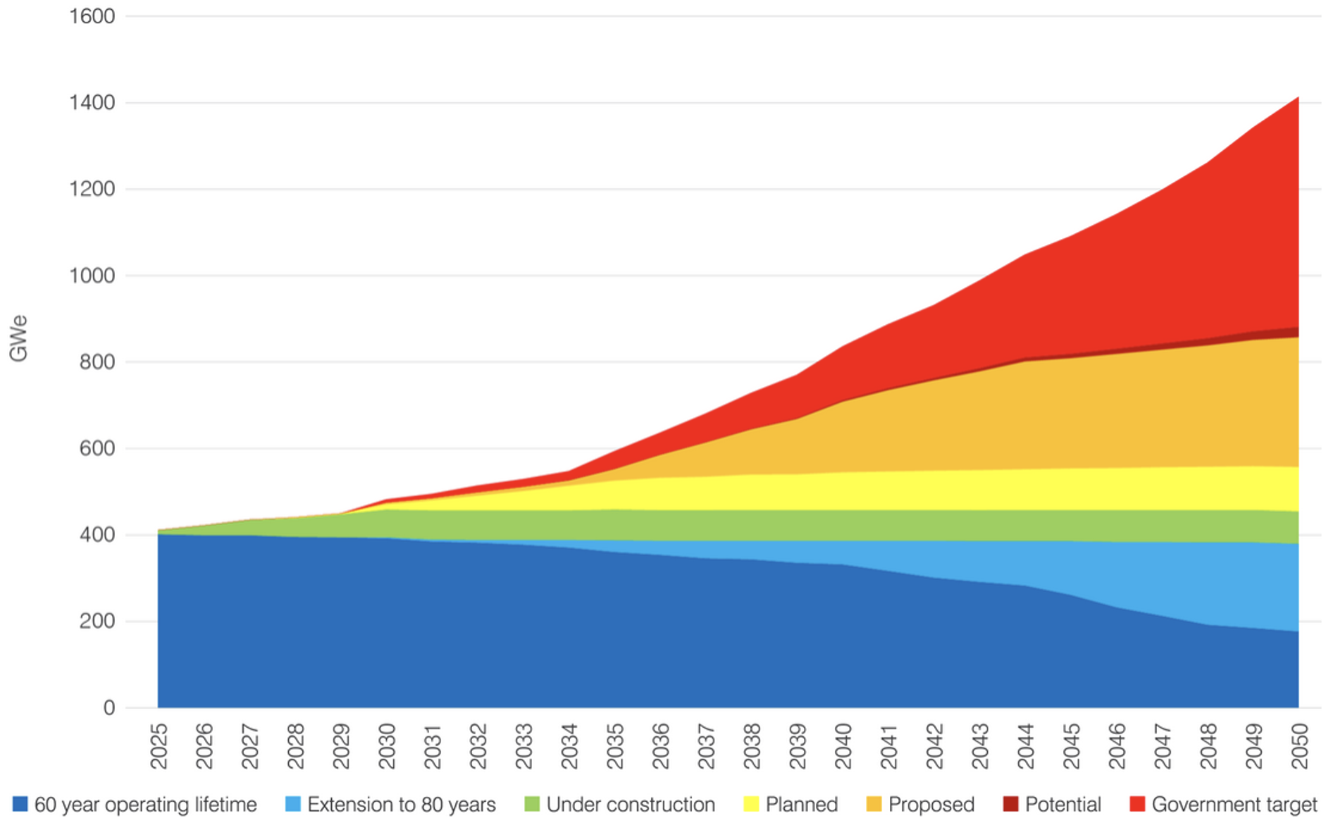 China arbeitet derzeit daran, 27 neue Reaktoren zu bauen und auch Frankreich will seinen Bestand in den nächsten Jahren um sechs neue Anlagen erweitern1. Diese und weitere Bestrebungen berücksichtigt, könnte die Gesamtkapazität im Jahr 2050 weltweit 1428 Gigawatt elektrisch (GWe) erreichen.