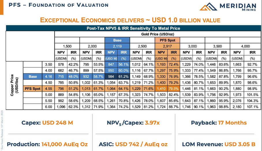 Die neue ‚Pre‑Feasibility‑Study‘ für ‚Cabaçal‘ liest sich wie ein Wirtschaftskrimi, indem natürlich kein geringerer als Meridian Mining (WKN: A3EUQY) die Hauptrolle spielt: Bei einem Goldpreis von konservativen 2.119,- USD je Unze (heute rund 3.300 USD) und nur 4,16 USD je Pfund Kupfer (heute rund 5,45 USD) spuckt das Modell schon einen nach Steuern diskontierten Kapitalwert von sage und schreibe 984 Mio. USD sowie eine fulminante ‚IRR‘ von 61 % aus.