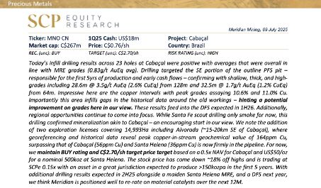 Nur wenige Wochen später folgte der nächste Paukenschlag aus dem Bohrkern: Denn am 9. Juli meldete Meridian (WKN: A3EUQY) im südöstlichen Teil der künftigen Grube 28,6 m mit 3,5 g/t Gold Äquivalent (AuEq) bzw. 2,6 % Kupfer Äquivalent (CuEq) (Bohrloch CD‑702) – inklusive Spitzenwerten von über 11 % Kupfer. Parallel dazu sorgt ‚Santa Helena‘ für zusätzlichen Adrenalin‑Schub: Dort traf CD‑660 11,6 m mit 5,9 g/t AuEq und lieferte obendrein den bisher höchsten Einzelwert der Unternehmensgeschichte von 25,4 g/t Gold plus 449 g/t Silber. Solche Treffer erhöhen nicht nur das künftige Ressourceninventar – sie sprechen auch für eine klare Aufwertung im anstehenden Definitive‑Study‑Modell.