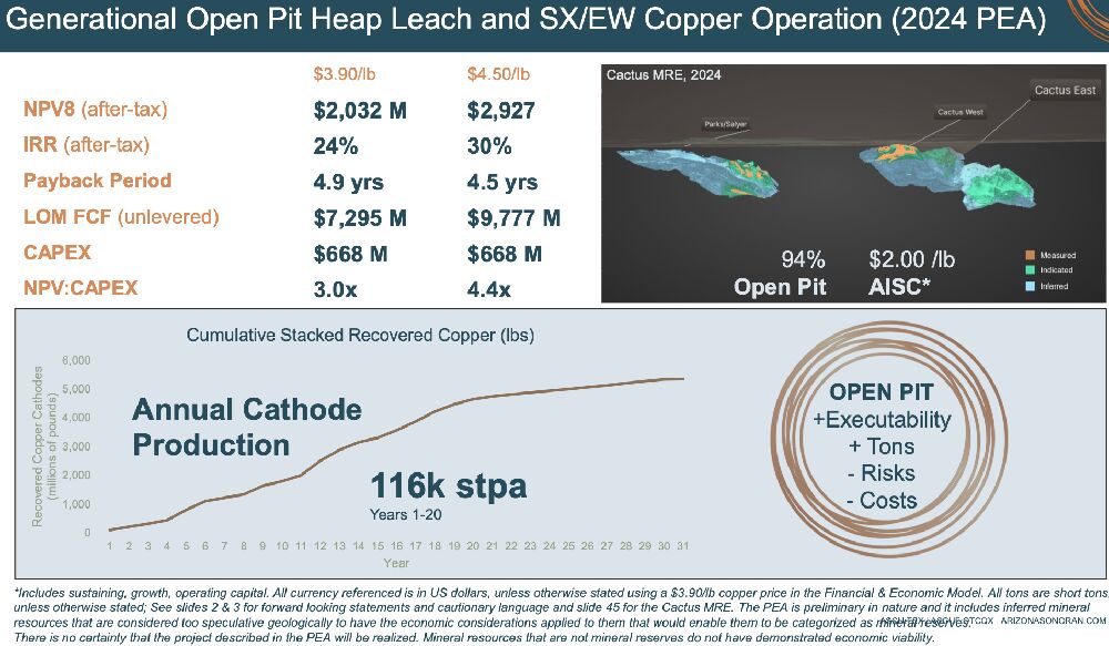 Die Voraussetzungen könnten kaum besser sein. Arizona Sonoran Copper (WKN: A3C8MS) besitzt ‚Cactus‘ ein riesiges Vorkommen, das dank modernster ‚Heap-Leach‘-Technologie mit niedrigen Investitionskosten hohe Produktionsraten verspricht. Die Wirtschaftlichkeit ist beeindruckend: Mit einem Nachsteuer-‚NPV‘ von 2,03 Mrd. USD und einer internen Rendite (‚IRR‘) von 24 % (bei einem angenommenen Kupferpreis von 3,90 USD pro Pfund) hebt sich das Projekt positiv von der Konkurrenz ab. Zum Vergleich, aktuell notiert der Kupferpreis bei etwa 4,70 USD je Pfund!