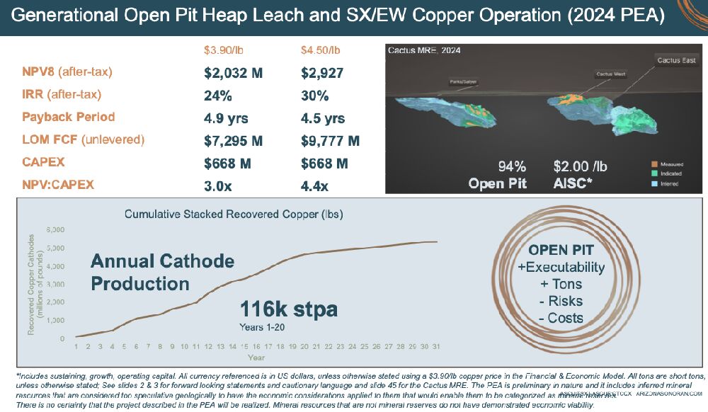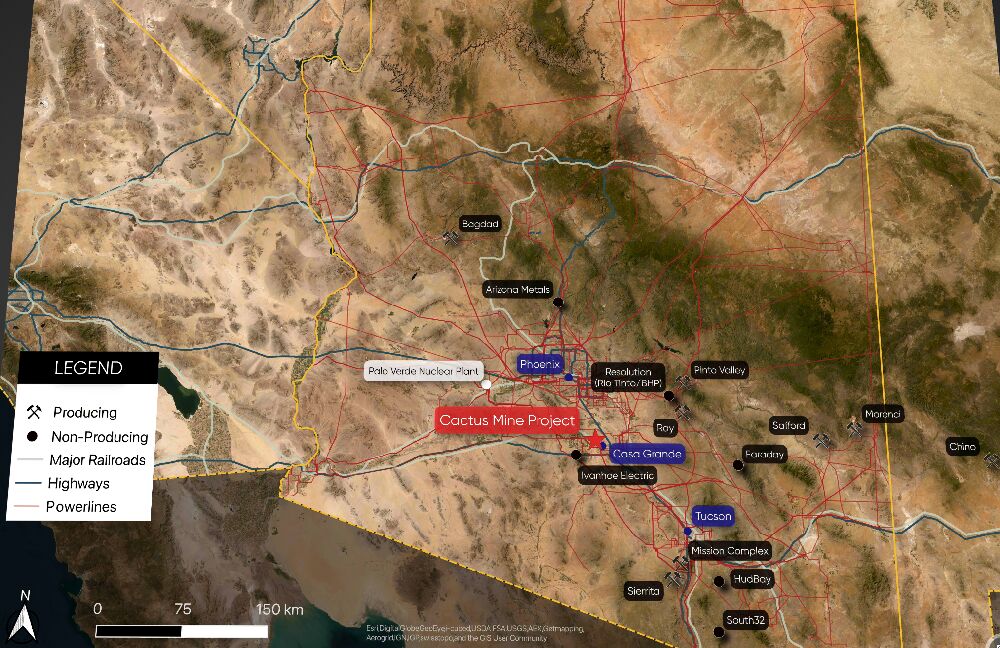 Der grandiose Kupfer-‚Claim‘ liegt in Arizona und damit in DEM Kupfer-Hotspot der USA mit einer jährlichen Produktion von 700 Millionen Pfund (Stand: 2024). ‚Cactus‘ sitzt auf unglaublichen 632,6 Millionen kurzen Tonnen mit grandiosen 0,58 % Gesamtkupfer (CuT) für 7,3 Milliarden Pfund Kupfer in der Kategorie ‚Gemessen und Angezeigt‘.