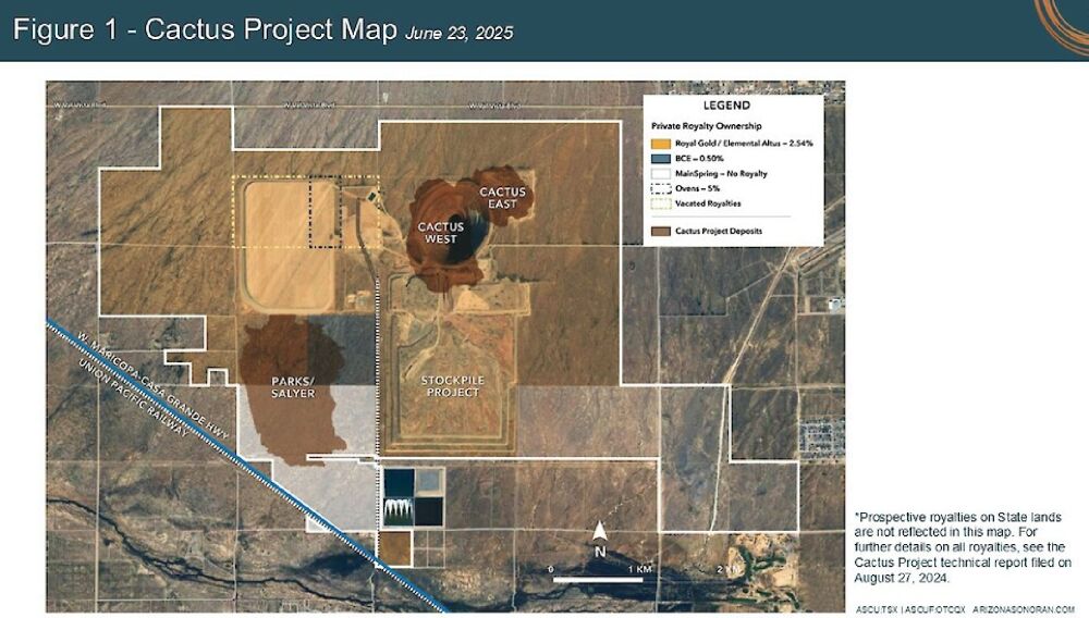 Ende Juni hat Arizona Sonoran Copper (WKN: A3C8MS) über seine Tochtergesellschaften Cactus 110 LLC und Arizona Sonoran Copper Company USA, seine Kaufrechte von 0,64 % bestimmter Nettoschmelzgebühren ausgeübt. Bei diesem ‚Buy-down‘ wurden insgesamt 8,91 Mio. USD in bar an die Tochter von Royal Gold Inc., RG Royalties LLC, und an Elemental Altus Royalties Corp. gezahlt, um den Gesamtprozentsatz der Schmelzlizenzen von 3,18 % auf die verbleibenden 2,54 % zu reduzieren.