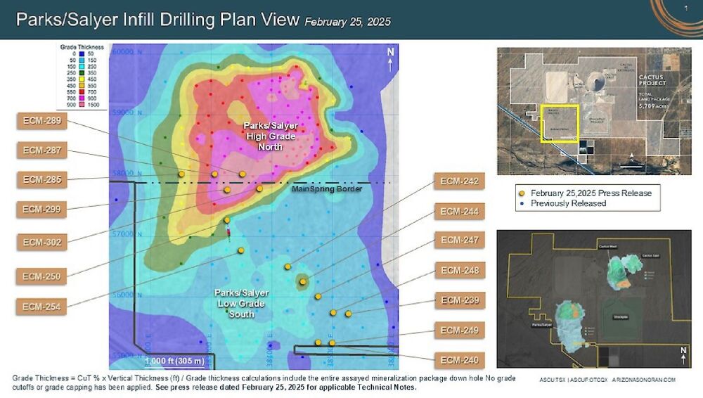 Diese 2,54 % beziehen sich auf die hochgradigen Lagerstätten ‚Cactus West‘ und ‚Cactus East‘ sowie auf einen Teil der Lagerstätte ‚Parks‘/‚Salyer‘. Hier wurde im Laufe kürzlich durchgeführter Bohrungen die Kontinuität der hochgradigen Mineralisierung unter anderem mit phänomenalen 0,74 % Kupfer (Cu) über 391 m, weiteren 0,74 % Cu über 465 m und mit satten 0,47 % Cu über 480 m sehr beeindruckend bestätigt, inklusive die Erweiterung des hochgradigen Kerns bis auf das Grundstück ‚MainSpring‘.