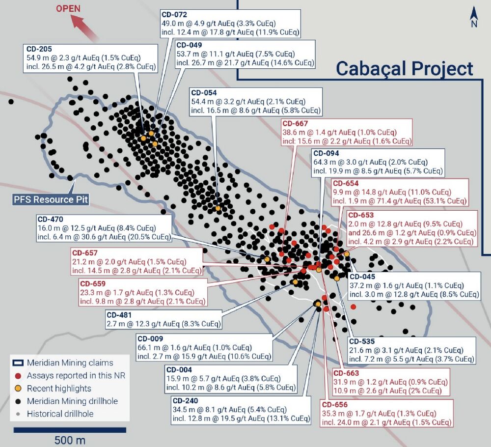 Quelle: Meridian Mining (Rote Pfeile weisen auf höhergradige Trends bei Bohrloch CD-654 hin.)